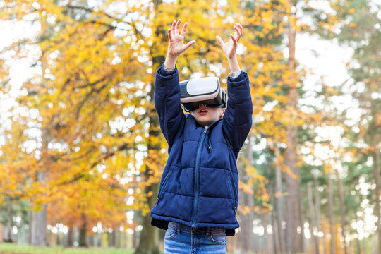 Boy using virtual reality simulator whiles standing with hand raised in forest