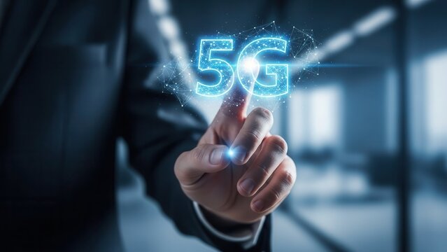 Closeup Businessman Hand touching virtual 5G icon, representing high-speed internet connectivity, next-generation telecommunications, and mobile network infrastructure