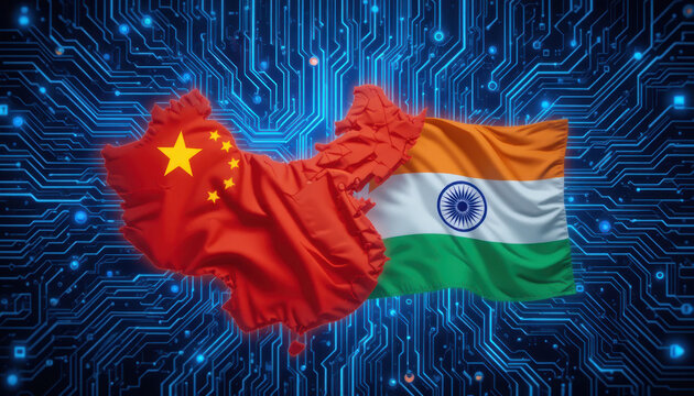 Digital technology rivalry china vs india global innovation landscape flag representation virtual environment dynamic perspective
