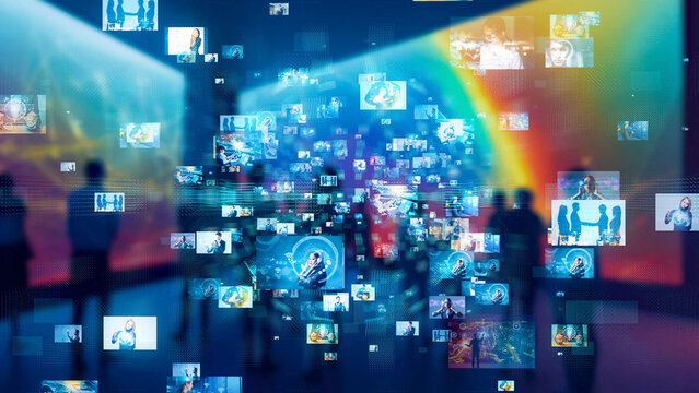 People at an art gallery and video contents concept. Virtual museum.