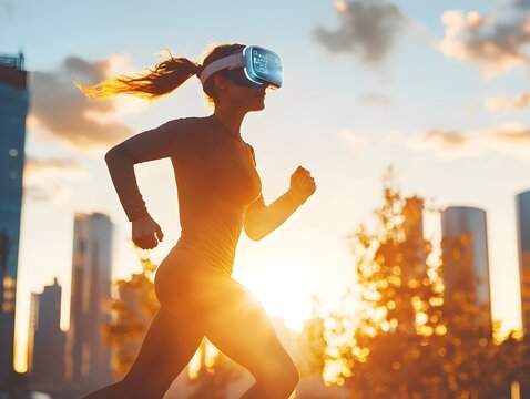 Woman using virtual reality on treadmill in modern gym environment
