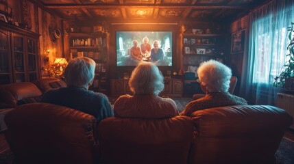 A group of elderly citizens attending a virtual family reunion with life-like holographic projections of family members in their living room