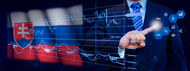 Businessman touching data analytics process system with KPI financial charts, dashboard of stock and marketing on virtual interface. With Slovakia flag in background.