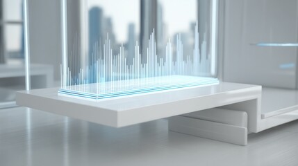 Hand Interacting with Digital Chart Display on Transparent Interface in Brightly Lit Office with Blurred Background