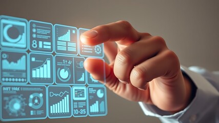 Digital transformation depicts hand interacting with virtual data charts for visualizing business intelligence and financial market analysis