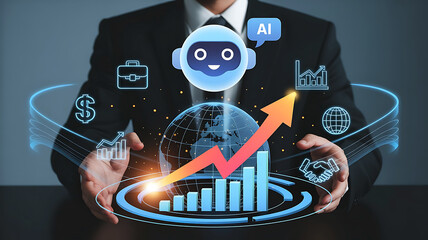 Businessman holding a futuristic digital interface showcasing artificial intelligence and financial growth charts