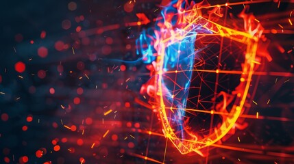 Abstract digital shield with fiery, dynamic colors representing cybersecurity and protection against threats, background of data particles.