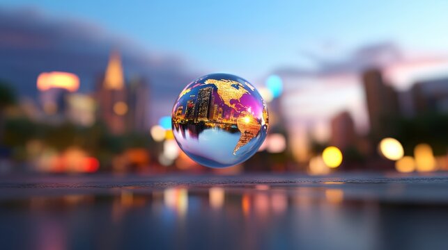 Digital Metropolis: Translucent Globe Over Futuristic Cityscape with Shifting Continents Representing Fluid Digital Geography