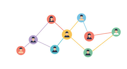Abstract illustration showing various user avatars linked together in a colorful, interconnected social network.