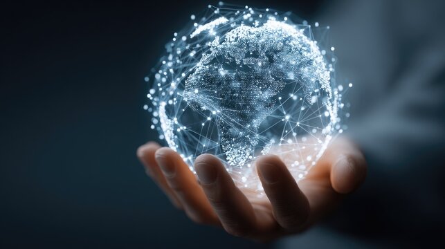 A person holds a digital holographic globe projection with network connections, symbolizing global technology and digital communication.