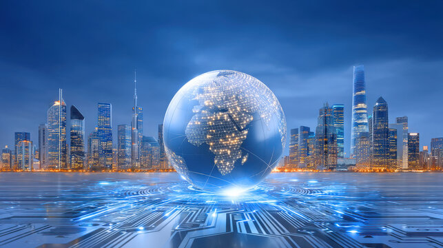 Glowing digital globe pulsing over futuristic data dashboard with circuit network overlay