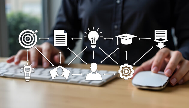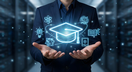 Hand holding virtual graduation cap, representing online education and technology in learning, with futuristic digital interface.