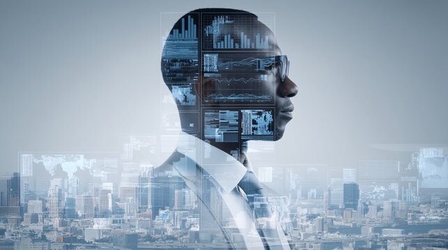 Futuristic digital interface with virtual graphs and maps