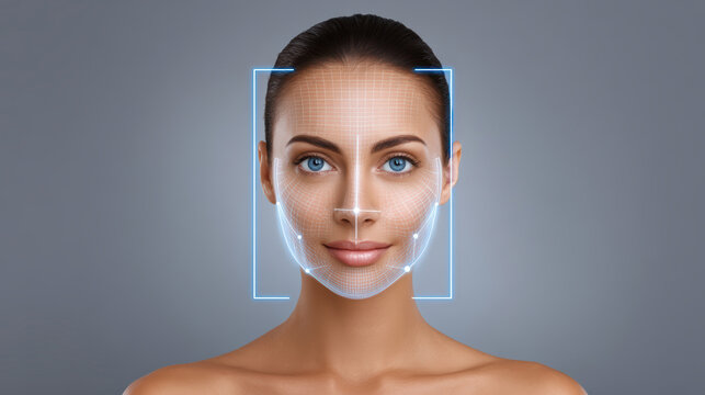 Digital face scan, glowing molecular grid overlaying skin, blue eyes, beauty, technology, futuristic, smooth complexion
