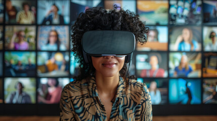 A professional woman in a VR headset engages in a global meeting her virtual presence connecting continents