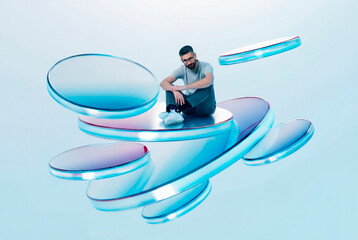 Seated man on 3D layers in levitating platform scene