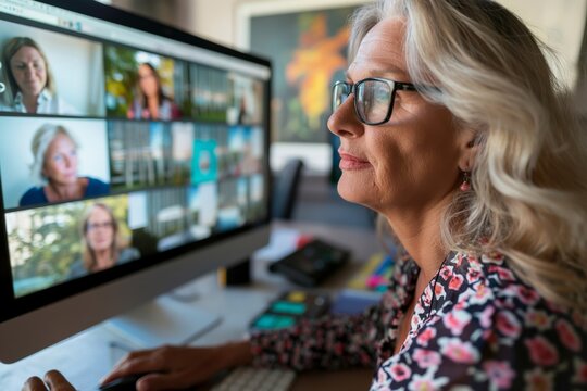 Mature woman teacher conducts an engaging online class, interacting with students displayed on her large computer monitor