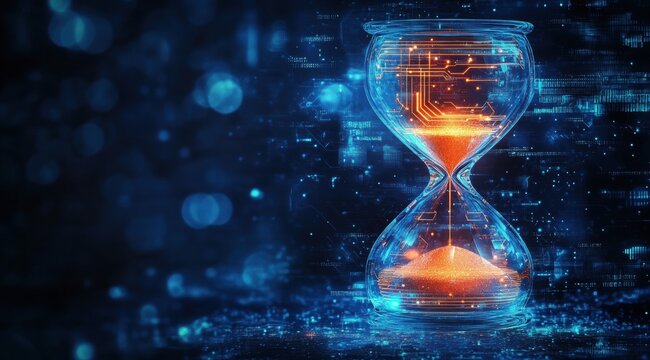 Abstract futuristic neon clock with pendulum marking virtual time lapse