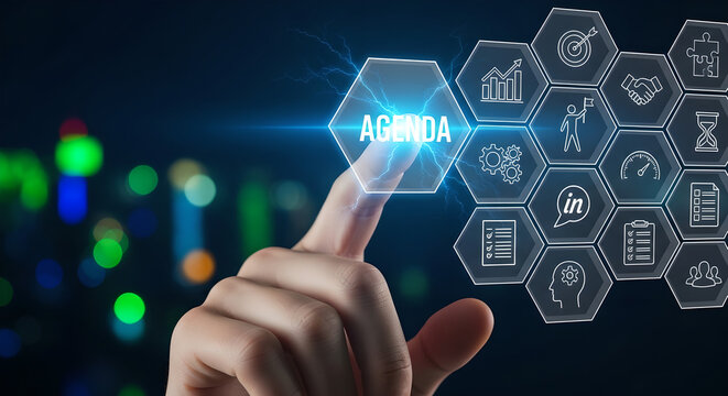 Person holding digital agenda icon with calendar and glowing circle schedule planning