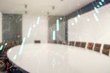 Multi exposure of virtual abstract financial chart hologram and world map on a modern meeting room background, research and analytics concept