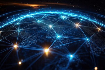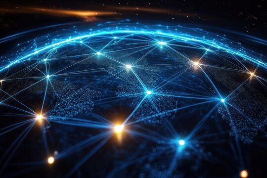 Digital network connections glowing with blue and orange light points spread across a dark globe representing global communication and data exchange