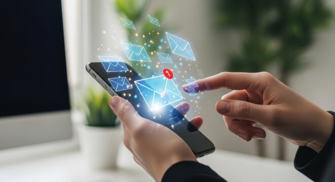 Photo of a persons hand holds a smartphone, with glowing email icons and notifications appearing above the screen, symbolizing digital communication and connectivity