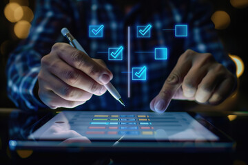 Dialing on virtual telephone keypad with transparent telephone buttons, businessman touch button of telephone number on screen, Finger touch number on smartphone to make a call, close up