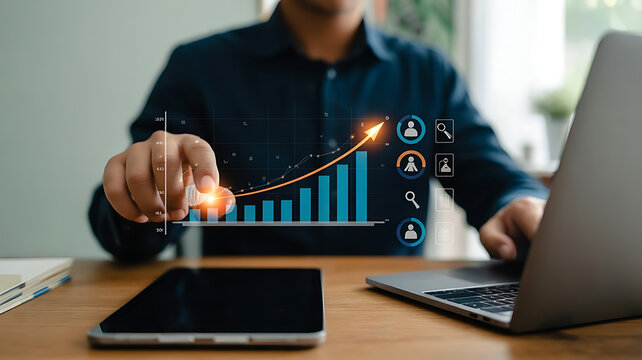 Professional analyzes vital business KPI and AI insights on a vivid interactive digital display