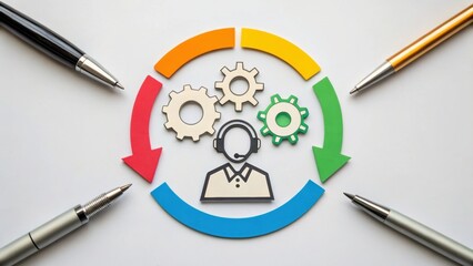virtual assistant multitasking concept. Conceptual illustration of workflow management with gears and a headset.