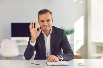 Happy smiling man in suit sitting at office desk, looking at camera and waving hand saying hello during video call. Webcam portrait of business coach, CEO, financial consultant or university professor