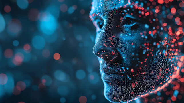 Holographic ai avatar blending into virtual horizon with floating hud panels and binary code