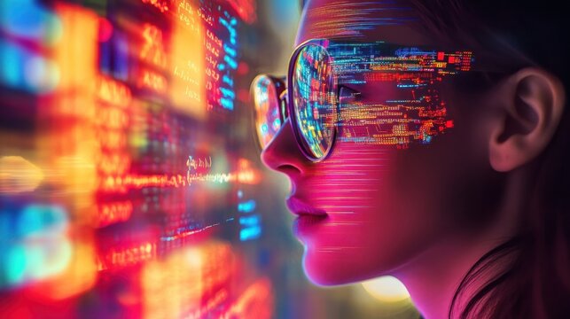 Woman explores augmented reality, where data and graphics are reflected in her eye. The scene is a mixture of reality and virtuality, where digital projections coexist with the surrounding environment