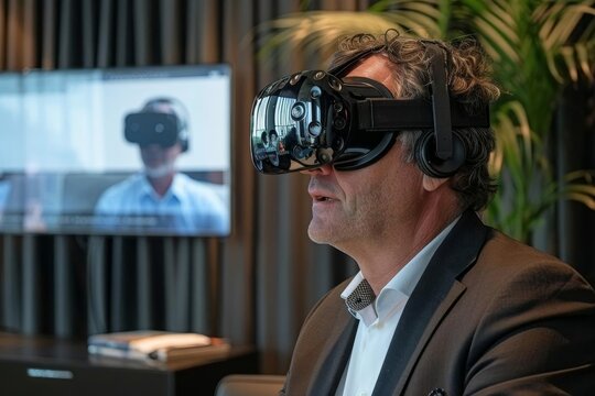 Businessman Presenting Virtual Reality Project to Investors with VR Headsets and Digital Displays