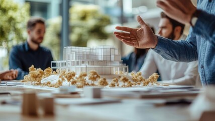 Architect presenting a 3D model to colleagues, focus on the model and hands gesturing, no faces visible