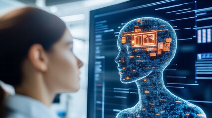 Artificial intelligence brain interacts with advanced technology during a futuristic demonstration in a tech lab environment