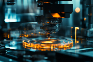 High tech precision equipment processing data disk with glowing circuits in futuristic lab, generative ai
