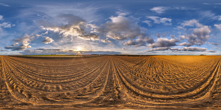 hdri 360 panorama on gravel road among farming fields with tire tracks in equirectangular full seamless spherical projection, for VR AR virtual reality content