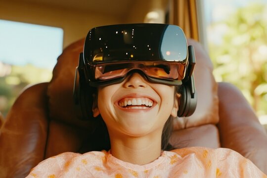 Children enjoying virtual reality experience on cozy couch