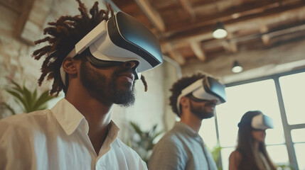 Young professionals engage in virtual reality experience in a modern workspace environment