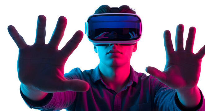 Teenager immersed in virtual reality experience, isolated background