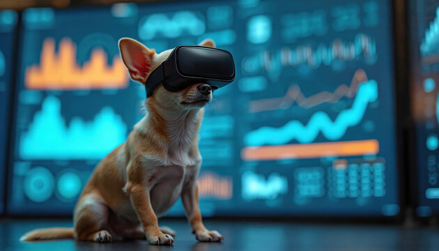 Small Chihuahua dog wearing VR headset, sits looking forward at digital data screens. Tech concept combines pet with high-tech trends, future technology, cyberspace. Virtual reality, modern