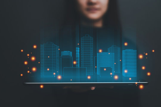 A woman using a digital tablet and a modern building hologram Real Estate Business and Building Technology Concepts.
