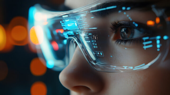 Closeup of a woman wearing futuristic augmented reality glasses with data overlay
