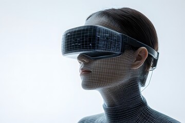 Woman wearing virtual reality headset with a digital wireframe overlay for technological concept.