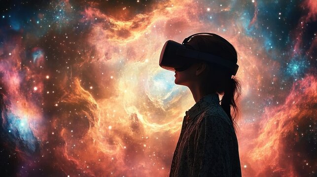 Metaverse technology concept, A young woman wearing a VR headset looks upwards, immersed in a digital world with a futuristic blue and green glow.