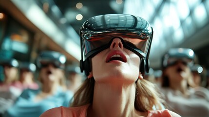 A group of individuals wearing virtual reality headsets immerses themselves in an engaging and futuristic experience, highlighting technology's role in entertainment and social interaction.