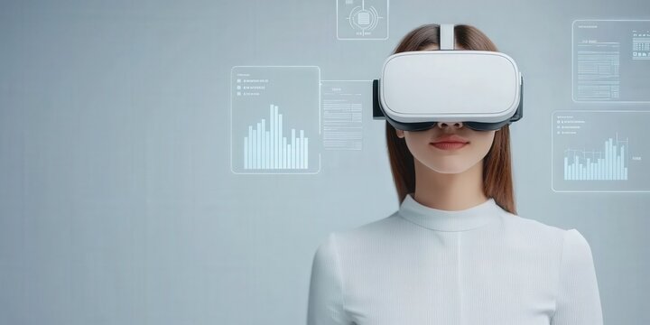 Woman immersed in digital world with virtual reality glasses and floating graphs and charts.