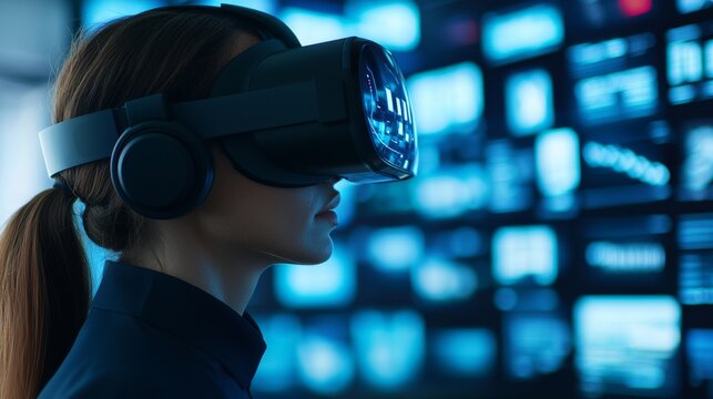 A person wearing a virtual reality headset, immersed in a digital environment, with data visualizations displayed in the background.