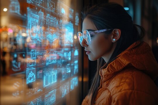 Woman Engaging with Virtual Reality Technology in a Futuristic Environment with Data Visualizations and Interactive Interface Elements