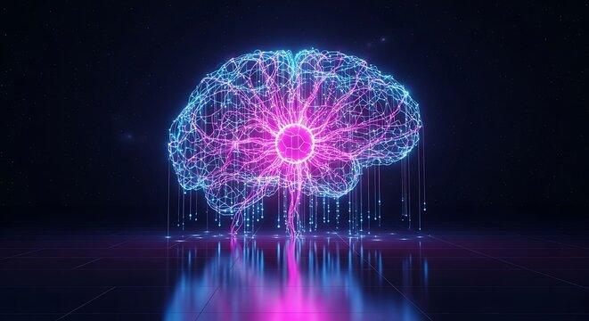 The Colorful Abstract Digital Brain with Glowing Neurons and Particles